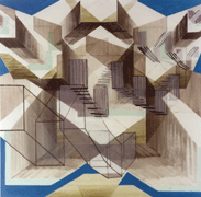 Drawings, prints and paintings by Juliet Kac explore variations of multiple perspectives in order to arrive at a framework in which four distinct images may be viewed simultaneously. A large frieze, composed of numerous permutations of a single image, has arisen out of research into the intersections between music and visual art. |